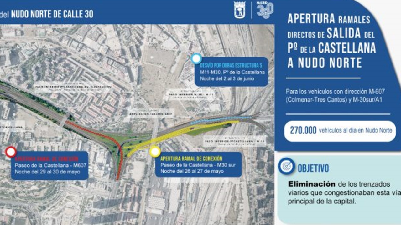 Durante la noche del próximo domingo al lunes, quedarán configurados de manera definitiva los accesos de las obras de remodelación del Nudo Norte desde el paseo de la Castellana en dirección a la M-607 (vehículos con dirección Colmenar-Tres Cantos) y hacia la M-30 sur. Esto provocará la eliminación de los trenzados viarios que congestionaban el Nudo Norte permitiendo ya la conexión directa de los vehículos con esas vías.