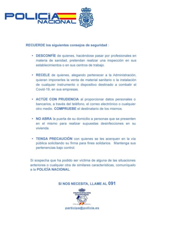 La policía Nacional, nos aporta unos consejos de seguridad sobre alguna de las modalidades delictivas detectadas últimamente aprovechándose de la situación actual.