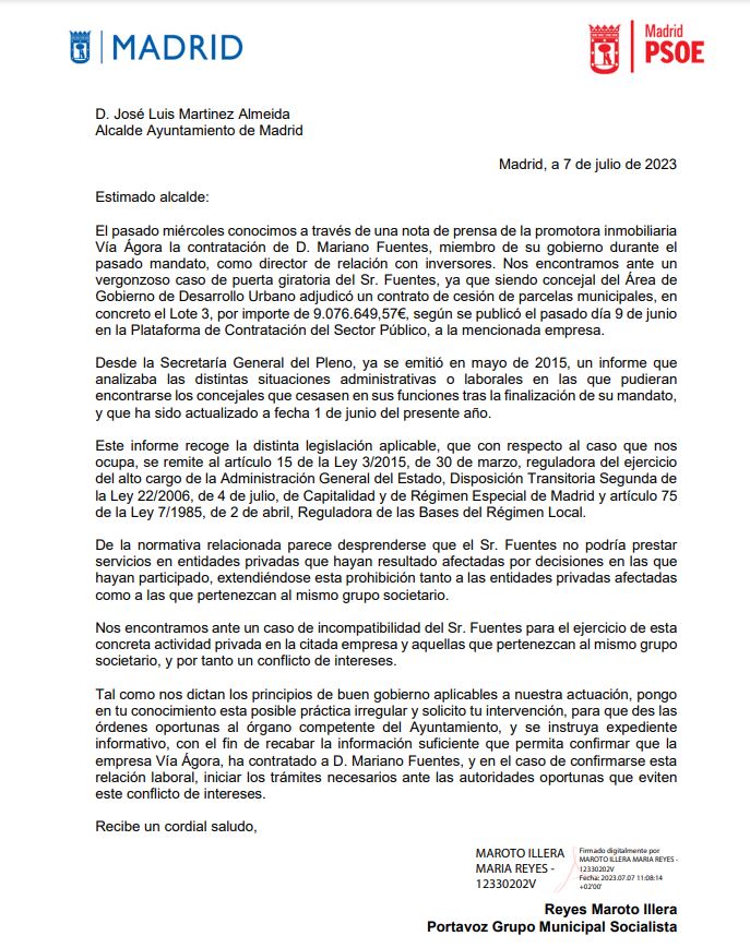 El PSOE, por su parte, también ha movido ficha en este asunto. Así, ha enviado una carta al alcalde pidiéndole que abra un procedimiento de incompatibilidad a Mariano Fuentes. Consideran que es un "un vergonzoso caso de puerta giratoria".