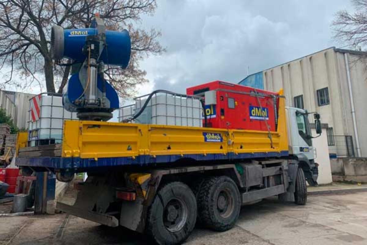 Madrid suma medidas de contención frente al virus. El siguiente paso que ha avanzado el consistorio madrileño va en la senda de la desinfección de vía pública. Se trata de un camión que cuenta con un cañón y dos depósitos de 1.000 litros de capacidad para dar cabida a la solución de agua y lejía.