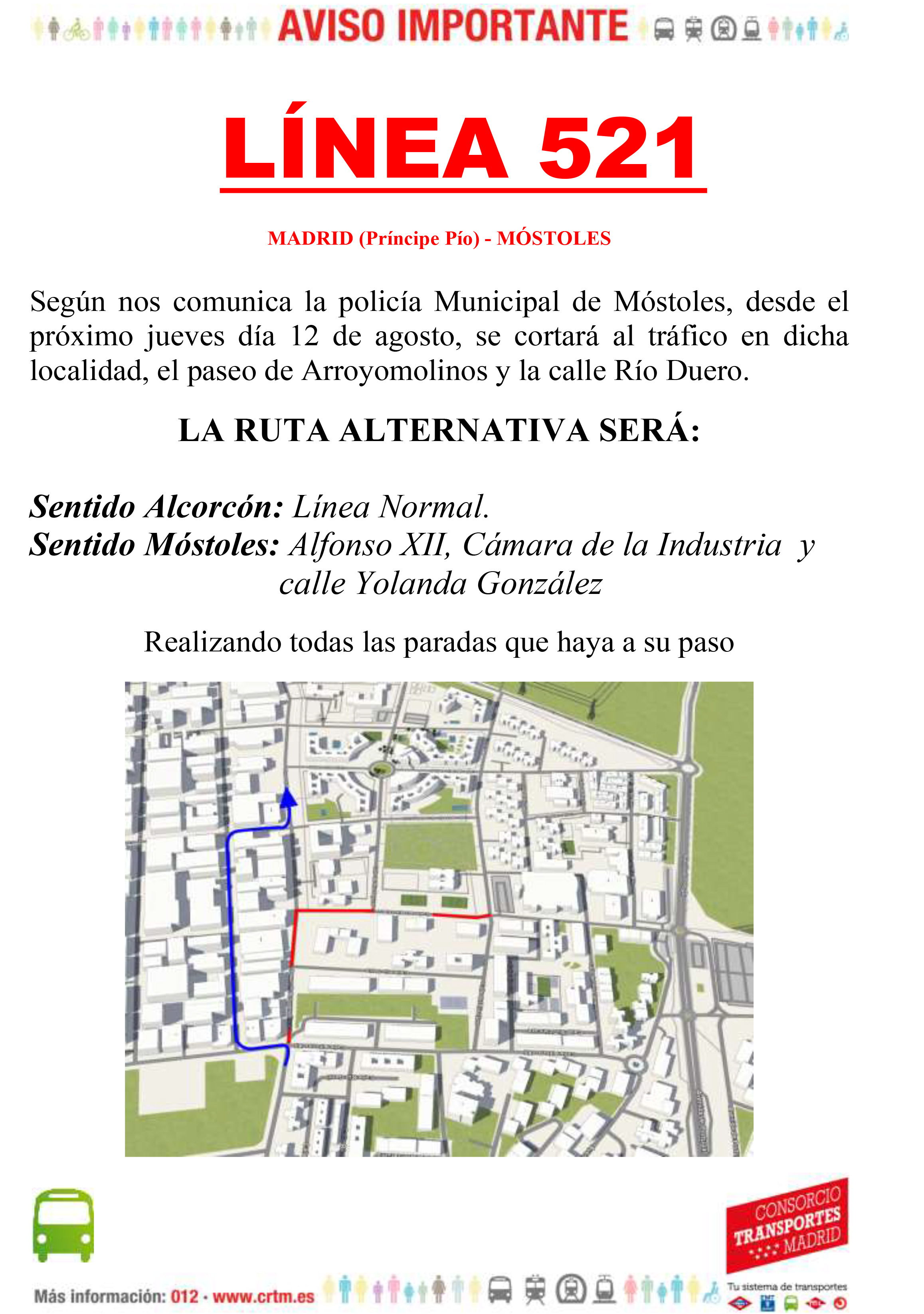 Por su parte, la línea 521 tendrá las mismas modificaciones que la línea anterior. La diferencia es que la línea 521 es Madrid (Príncipe Pío)- Móstoles, mientras que la línea 520 Alcorcón- Móstoles.