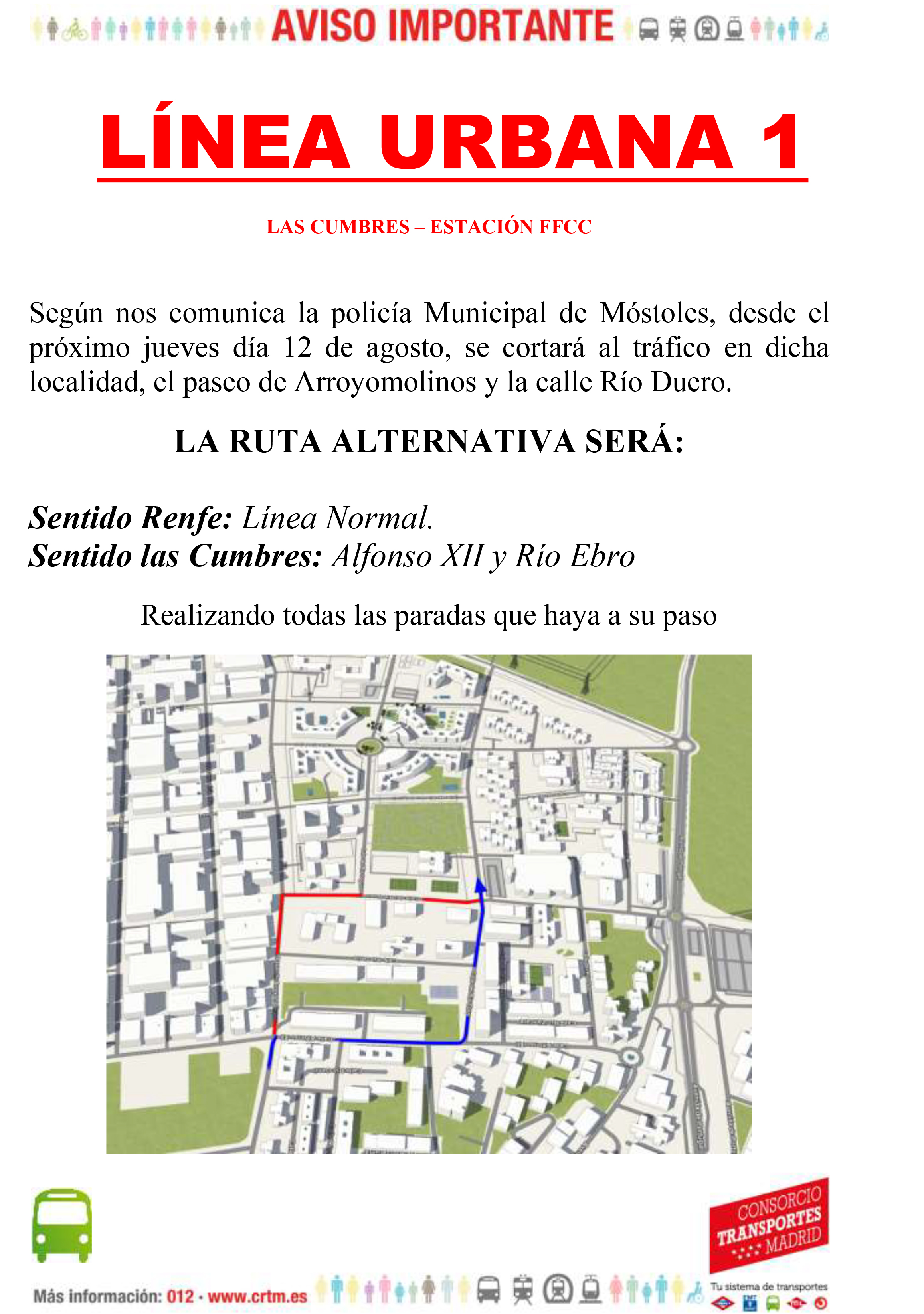 La línea Urbana 1 tiene los mismos cortes de tráfico que las dos líneas anteriores pero está tiene una alternativa diferente. En sentido Renfe se realizará la línea normal, igual que se venía haciendo hasta ahora, pero en sentido Las Cumbres pasará por la calle Alfonso XII y Río Ebro.