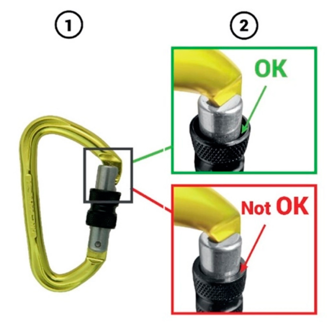 2. Comprueba la posición del cierre de rosca. Si la parte hueca quedara arriba, el mosquetón está bien, pero si la parte plana queda arriba sería defectuoso (mira la foto).