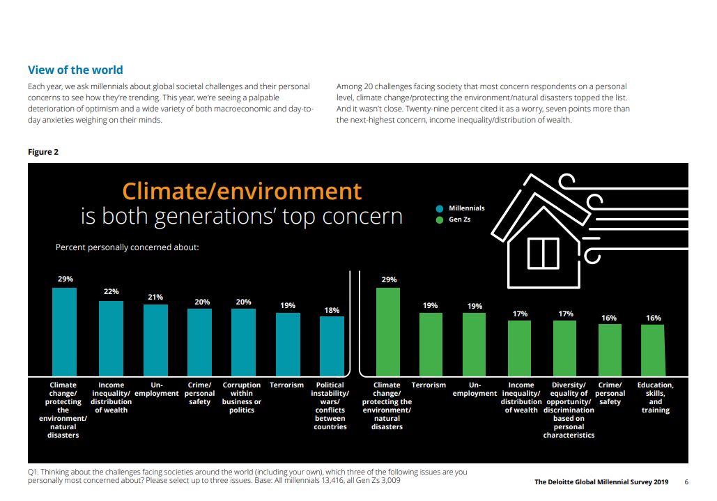 Los datos son claros, para ambas generaciones a nivel mundial, la principal preocupación es el cambio climático, la protección del medio ambiente y los desastres naturales, aunque lo que más inquieta a los jóvenes españoles es el desempleo. A pesar de ello, según los datos de julio del CIS, los problemas medioambientales son señalados como principal problema en España por el 2,7% de jóvenes, reduciéndose al 1,2% según la edad avanza.