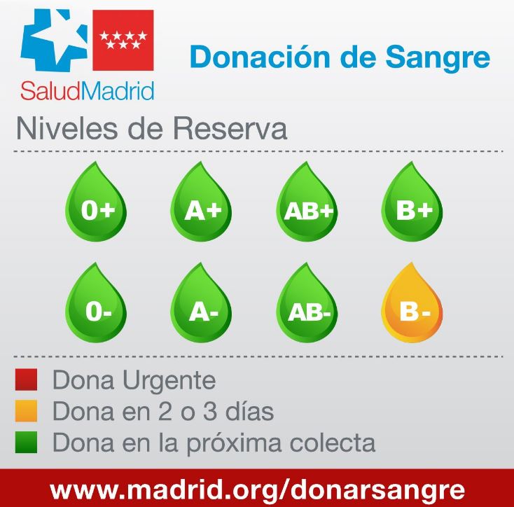 El Centro de Transfusión de la Comunidad de Madrid realizó el pasado 25 de febrero un llamamiento para la donación de sangre del grupo B-, que se encuentra en nivel amarillo. Las reservas de sangre de los demás grupos son estables, pero el problema surge con este grupo que, según han indicado desde el propio centro, “se trata de un grupo muy pequeño, apenas el 2% de la población y le cuesta más remontar”.