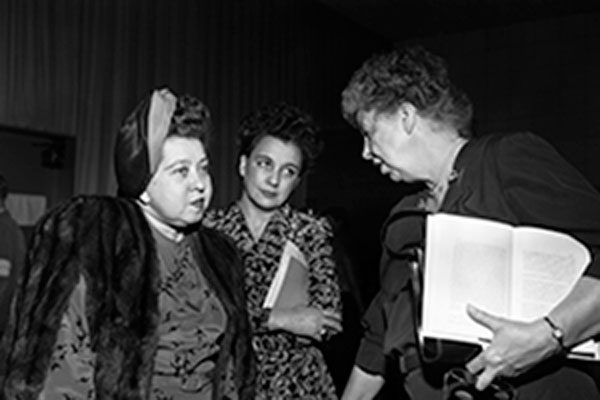 Eleanor Roosevelt de los Estados Unidos de América (derecha), Presidenta de la Comisión de Derechos Humanos, con Minerva Bernadino de la República Dominicana (izquierda) y Ana Figueroa de Chile (centro), ambas delegadas ante la Comisión de Derechos Humanos, en Lake Success (Nueva York), en mayo de 1949. Foto ONU/MB.