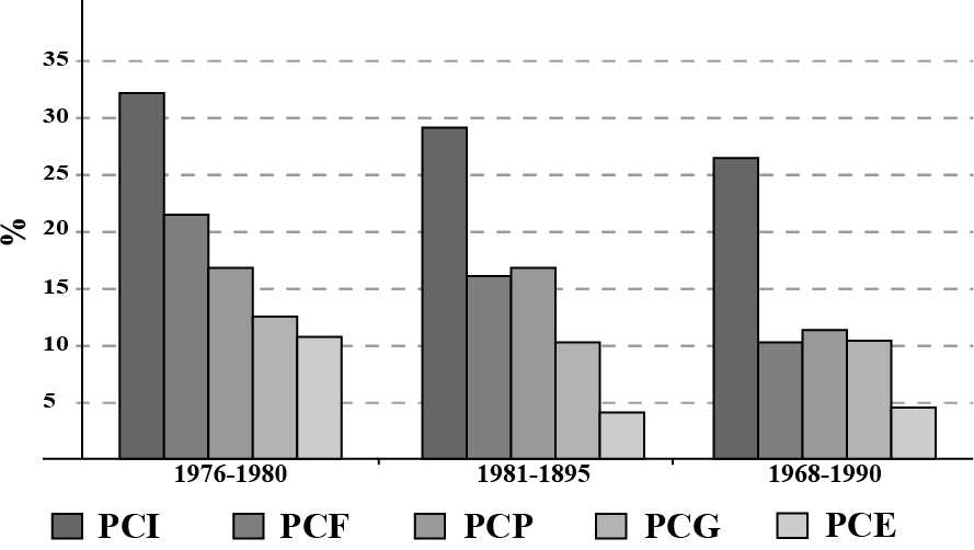 En el estado italiano, el PCI llegó a contar con el 34,37% de los votantes. De hecho. rozó el poder. No obstante, desde ese momento comenzó un progresiva pérdida de votos hasta bajar al 29,89% en 1987. El resto de los partidos europeos también sufrieron retrocesos electorales esos mismos años, aunque muy lejos de los resultados de Berlinguer. Por ejemplo, el Partido Comunista Francés (PCF) pasó de un 21,39% en 1973 a un 11,32% en 1988. Por su parte, el Partido Comunista Portugués (PCP) disminuiría desde el 17% cosechado en 1980 al 12,2% de 1987.
