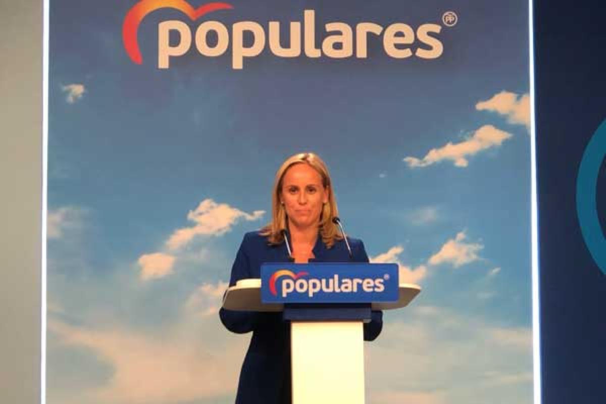 Ana Camins atendiendo a los medios en la rueda de prensa posterior a la Junta Directiva Autonómica celebrada ayer en Génova.