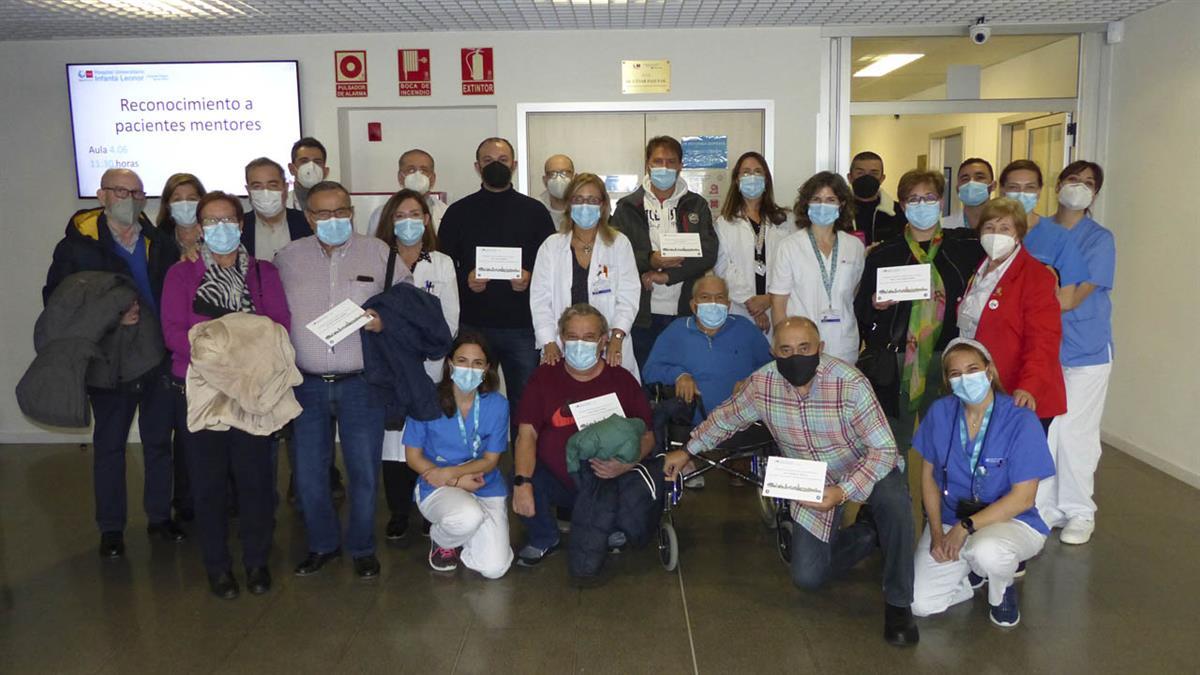 El Hospital Universitario Infanta Leonor ha querido reconocer la labor de sus pacientes “mentores”, aquellos enfermos renales crónicos que se encuentran en cualquiera de las opciones de tratamiento renal sustitutivo, bien sea por llevar tiempo en diálisis, o porque ya han sido trasplantados. A través de su experiencia, también informan y ayudan de manera voluntaria a otras personas en su misma situación a la hora de que éstas puedan adaptarse lo mejor posible y afrontar la enfermedad. Unas vivencias que pudieron trasladar, de igual modo, en el emotivo acto que realizó el centro, presidido por la directora gerente de este centro hospitalario, Dra. Carmen Pantoja Zarza, junto a la jefa de Nefrología, Dra. Patricia de Sequera, la facultativa del Servicio de Nefrología y líder del proyecto del ‘Paciente Mentor’, Dra. Marta Puerta Carretero, la enfermera responsable de este proyecto, Pilar Díaz de Argote, y el jefe de Sección de Psiquiatría y Salud Mental, Dr. Fernando Mora.