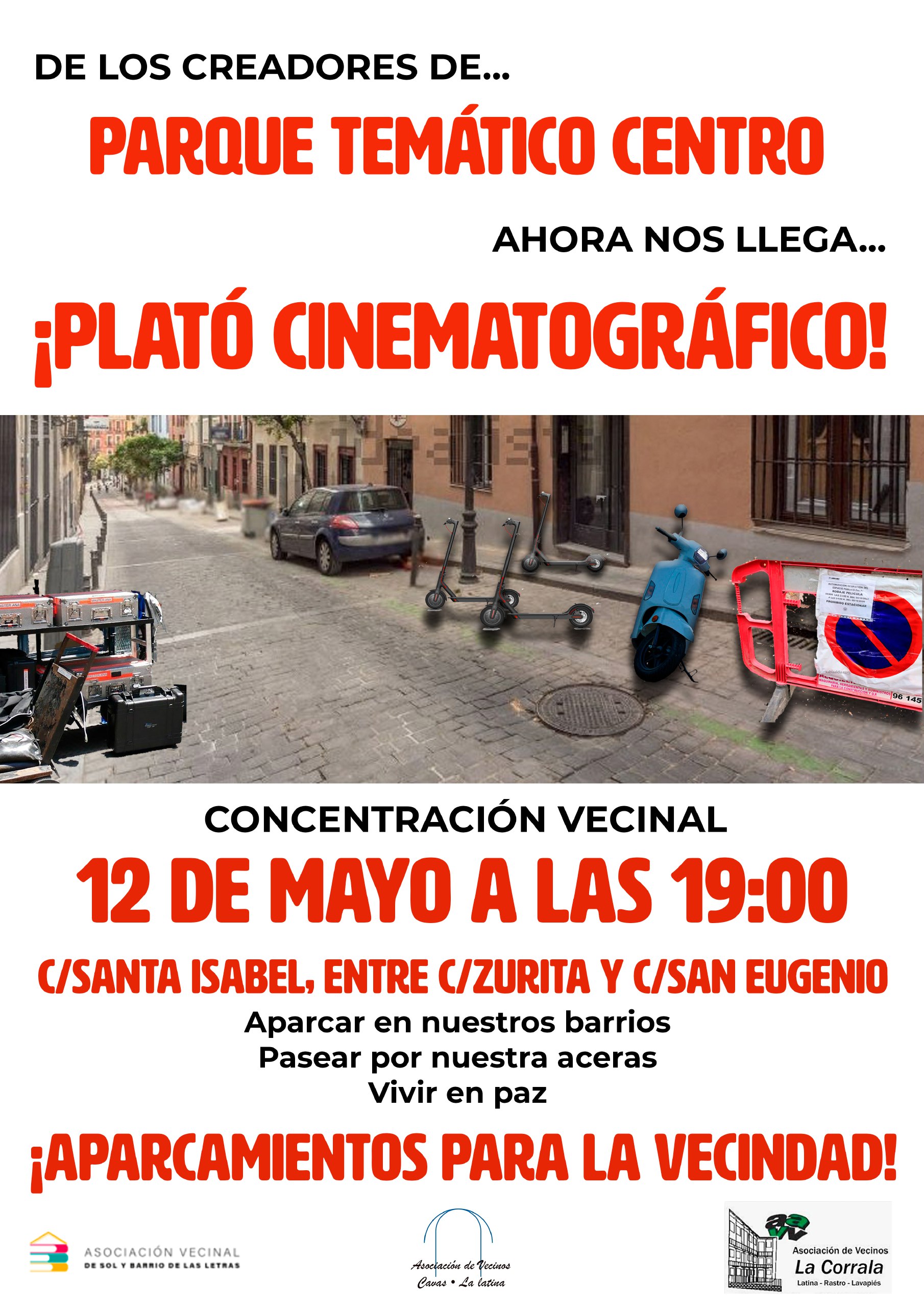 “De los creadores de Parque temático Centro ahora nos llega ¡Plató Cinematográfico!”. Las Asociaciones Vecinales de Sol y Barrio de Las Letras, La Corrala de Lavapiés y Cavas-La Latina han tirado de ironía para convocar a sus vecindarios a una concentración de protesta que tendrá lugar el próximo jueves, 12 de mayo, a las 19:00 en la calle Santa Isabel de Madrid, entre las calles Zurita y San Eugenio.