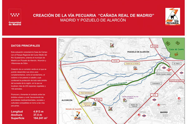 El martes pasado el Consejo de Gobierno de la Comunidad de Madrid ha aprobado la creación de la vía pecuaria Cañada Real de Madrid, la cual se situará en los términos municipales de Madrid y Pozuelo de Alarcón. Esta vía dará prioridad al tránsito del ganado, aunque también permitirá el desarrollo de senderismo, ciclismo o paseos a caballo.