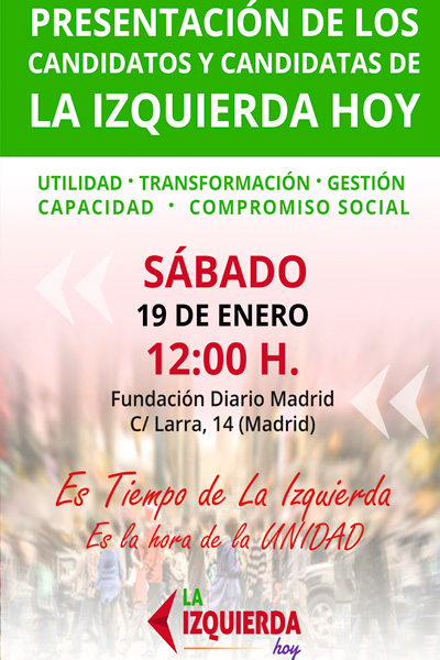 El partido político La Izquierda Hoy realizará un acto público con el fin de presentar a las personas que encabezarán las candidaturas de la Izquierda Hoy para las elecciones del 2019, con el objetivo de aglutinar en torno a formaciones de izquierdas y no dejar gobernar a la derecha representada por el PP, Ciudadanos o VOX.