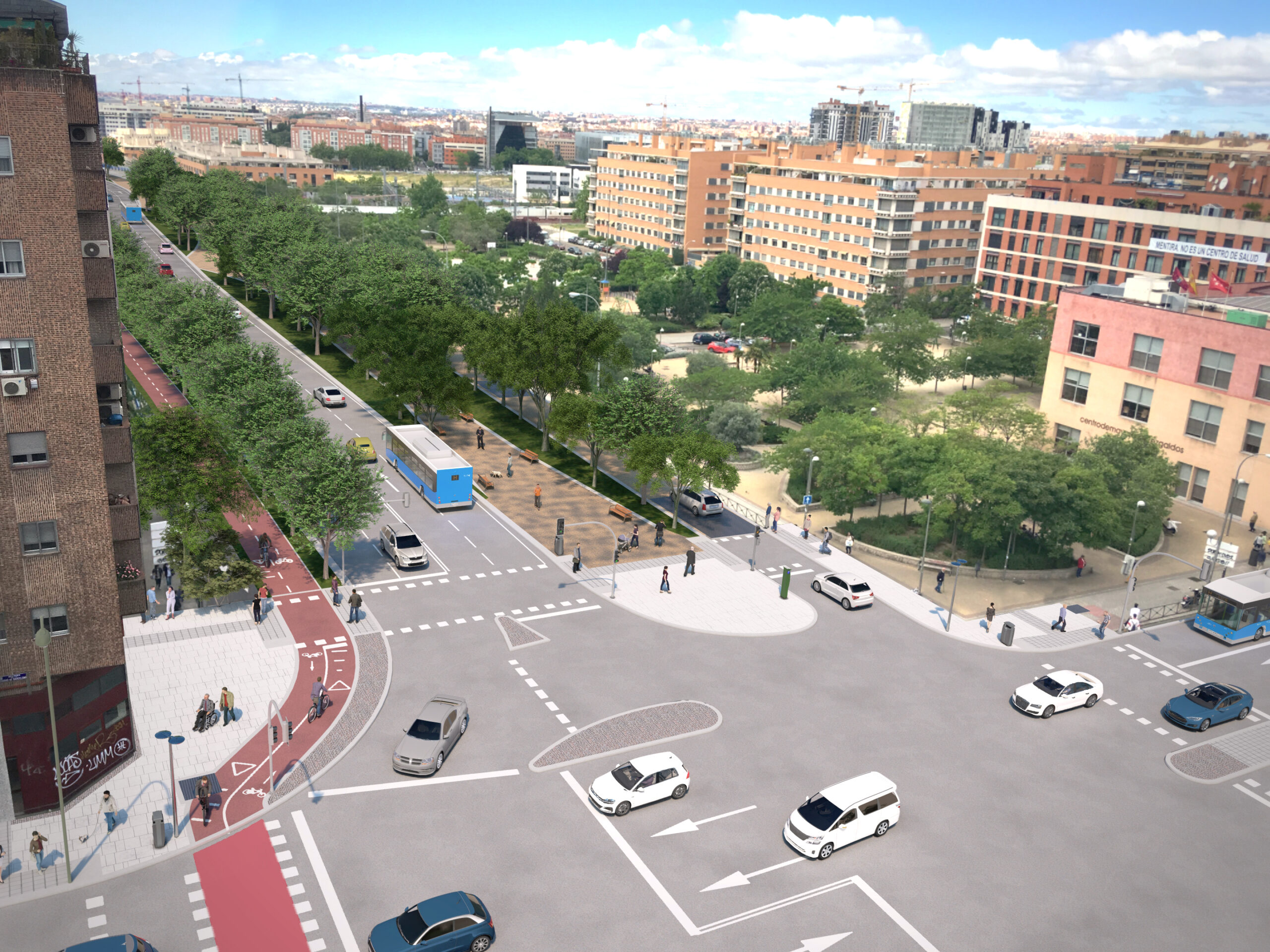 El eje resultante dispondrá de un carril por sentido para el transporte público y otro para el vehículo privado, además del carril bici bidireccional. Esto permitirá que la conexión entre ambos distritos pueda realizarse de manera cómoda y segura tanto caminando como en bicicleta, en transporte público y vehículo privado, reequilibrando el espacio destinado a cada modo de movilidad y dotándolo de mayor calidad paisajística y ambiental.