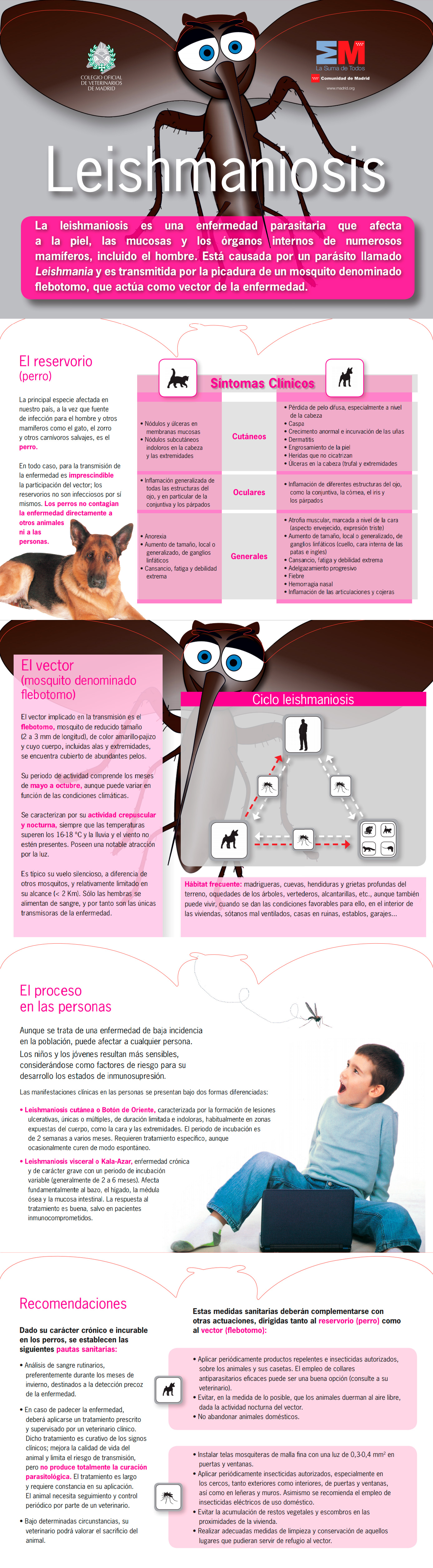 La Dirección General de Inspección y Ordenación Sanitaria de la Consejería de Sanidad de la Comunidad de Madrid y el Colegio Oficial de Veterinarios de Madrid (Colvema) han publicado un tríptico informativo sobre la leishmaniosis, en el que explican las consecuencias de la enfermedad zoonósica en personas y animales, y aportan recomendaciones sobre cómo prevenirla: