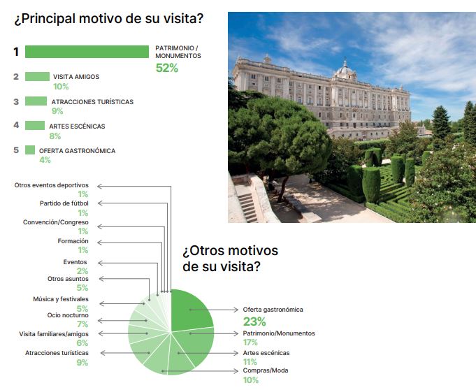 Conocer el rico y variado patrimonio cultural de la ciudad es el principal motivo por el que los turistas visitan Madrid, según la Encuesta de Percepción del Turista de 2022, elaborada por el Centro de Inteligencia Turística del Área de Turismo del Ayuntamiento de Madrid.