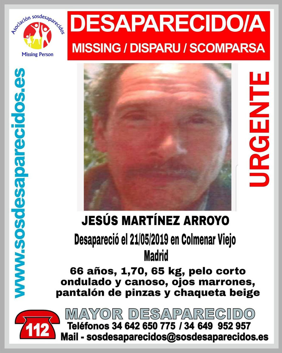 Jesús Martínez Arroyo desapareció el pasado 21 de mayo en la localidad de Colmenar Viejo en Madrid según informa la Asociacion SOSDesaparecidos a través de Twitter.