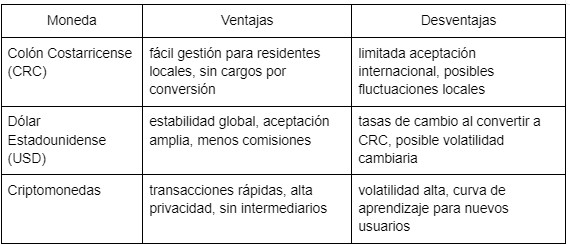 Se presenta una tabla que detalla las ventajas y desventajas principales de las monedas disponibles para usuarios en Costa Rica, ayudando a clarificar cuál puede ser la más conveniente según las necesidades personales y el tipo de apuesta.