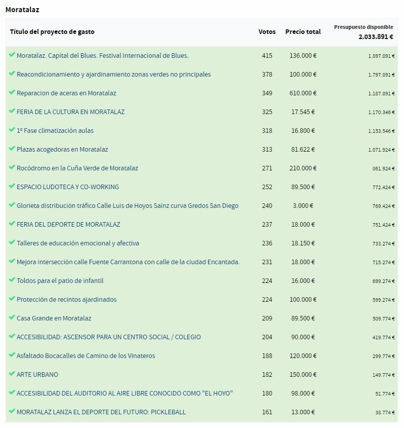Los vecinos y vecinas del distrito han podido votar a lo largo de los meses las propuestas de sus Presupuestos Participativos 2019. El pasado 26 de julio se hacían públicas las medidas más votadas y, en Moratalaz, ha ganado la música y la cultura. Con 415 votos, los vecinos del distrito se han unido para hacer del distrito la Capital del Blues con el Festival Internacional de Blues. Ésta ha sido la propuesta más votada, con la que se suman 20 las que financiará el Consistorio en este distrito. Un total de 2.033.891 euros se destinarán a ellas. Las más costosas de realizar son la reparación de aceras, que conllevará una inversión de 610.000 euros, y la creación de un rocódromo en la Cuña Verde.