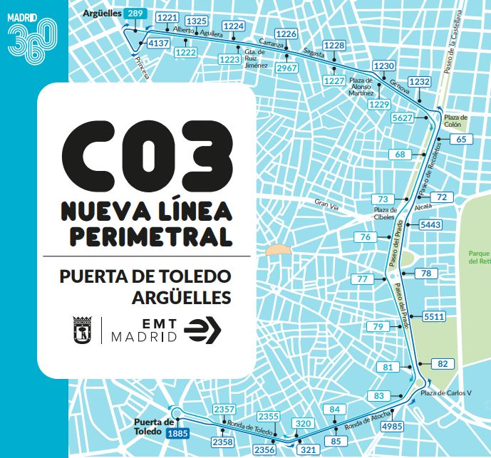 En el marco de la Estrategia de Sostenibilidad Ambiental Madrid 360, se inaugura una nueva línea, la tercera línea cero emisiones que el Ayuntamiento de Madrid y la EMT ponen en marcha. En este caso, a diferencia de las anteriores líneas cero que son gratuitas, 001 y 002, la nueva C03 está sujeta al mismo tipo de tarificación que el resto de líneas de la EMT. Se trata de la línea perimetral de la Empresa Municipal de Transportes (EMT) , que circunvala el distrito de Centro con autobuses 100 % eléctricos.