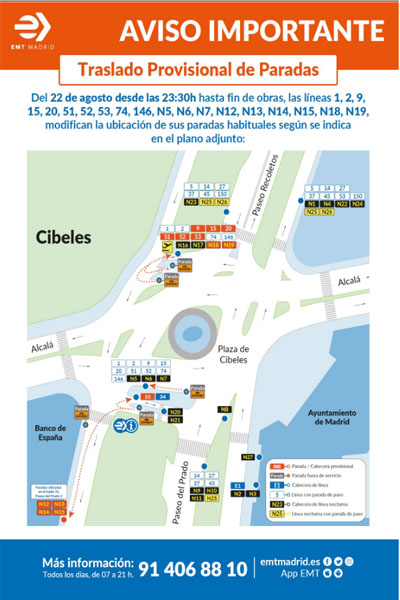 La Empresa Municipal de Transportes de Madrid (EMT) ha trasladado algunas paradas de autobús del entorno de la plaza de Cibeles por obras de asfaltado. Las primeras modificaciones se iniciaron el pasado lunes, 16 de agosto, y se ha previsto realizar nuevas ubicaciones de paradas a partir del próximo domingo, 22 de agosto, a medida que los trabajos en la calzada vayan avanzando. En total, 25 líneas diurnas y nocturnas (búhos) de EMT verán afectados sus emplazamientos estos días.
