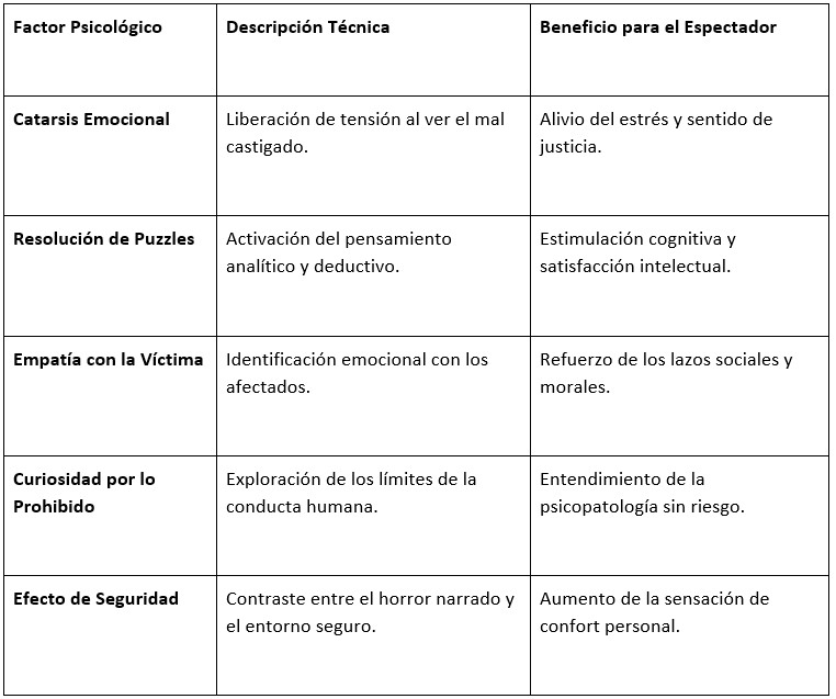 Esta fascinación por entender el "cómo" y el "por qué" es una forma de control. Al desmenuzar un caso complejo, sentimos que estamos adquiriendo herramientas para protegernos. Es una simulación de riesgo en un entorno controlado: experimentamos la adrenalina del peligro, pero con la certeza absoluta de que estamos a salvo.