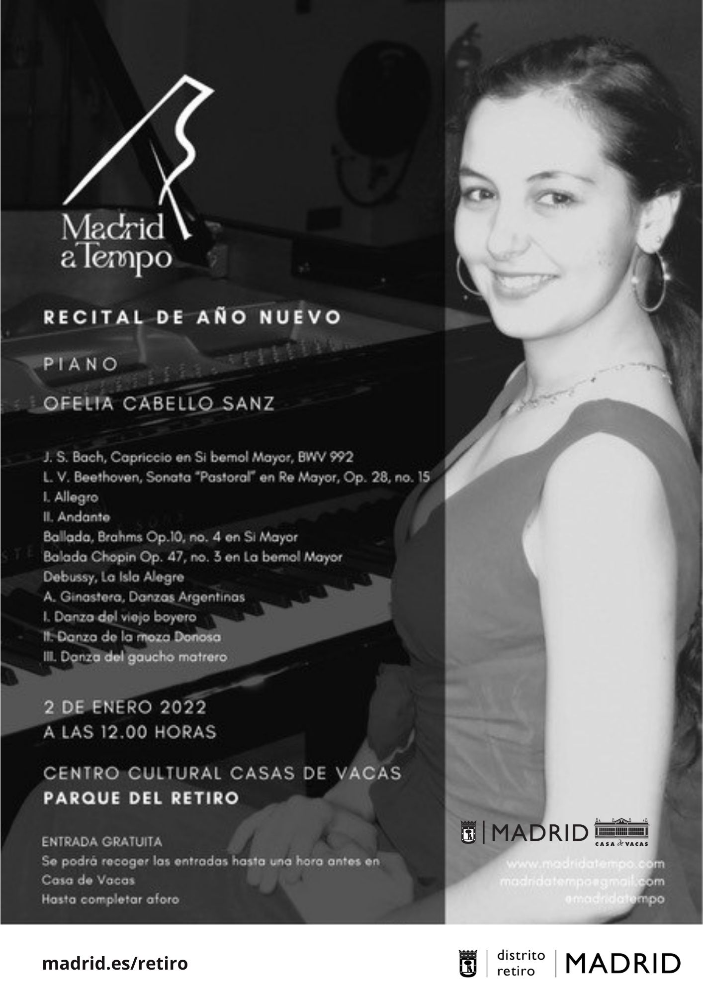 El concierto de Año Nuevo tendrá lugar el 2 de enero, a cargo de la intérprete madrileña Ofelia Cabello. Cabello inicia sus estudios musicales a los siete años en el Centro Integrado de Educación Musical Federico Moreno Torroba con el profesor Javier Rovira. En 2015 continúa sus estudios en el Real Conservatorio Superior de Música de Madrid y en 2019 realiza el máster de Interpretación Solista en el Conservatorio de Música de Utrecht (Países Bajos). Cabello ha ofrecido recitales como solista y músico de cámara en diferentes salas como el Auditorio Nacional de Madrid, la Residencia de Estudiantes, el Auditorio CentroCentro o el Tivoli Vredenburg en los Países Bajos. También ha participado en conciertos benéficos y otros proyectos como ‘Música de mujeres en las aulas’, organizado por la Asociación Mujeres en la Música, o el Ciclo de Mujeres Compositoras, organizado por el Instituto Cervantes de Utrecht.