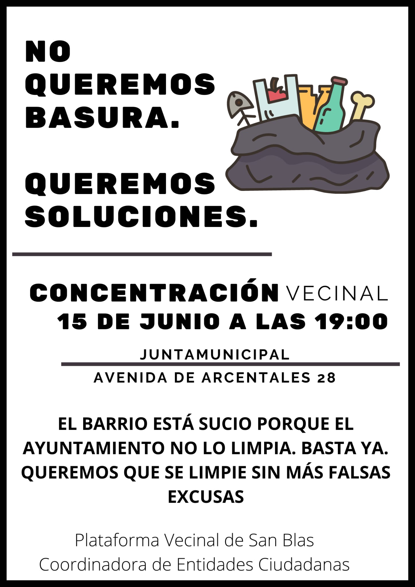 “Las vecinas y los vecinos reivindicamos y exigimos al Ayuntamiento el trato decente y humano que nos merecemos y una solución inmediata, que ponga remedio a la insalubridad que el mismo ha generado, que nos trate con respeto y dignidad y que asuma su responsabilidad ante esta situación”
