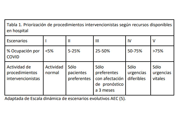 Por la posibilidad de un nuevo rebrote, “la Asociación Española de Cirujanos y la European Association for Endoscopic Surgery (EAES) tienen como referencia una Escala dinámica de escenarios de alerta durante la pandemia COVID-19. Cinco escenarios diferentes de alerta que tienen el objetivo de ordenar las recomendaciones relativas a las cirugías electivas y urgentes a nivel” del centro hospitalario. Esta escala se basa en el porcentaje de pacientes hospitalizados en planta y en las Unidades de Cuidados Intensivos por coronavirus “y en el número de camas hospitalarias habitualmente disponibles en cada centro hospitalario y a los recursos del hospital utilizados para atender a los pacientes infectados”. Desde el Ministerio, se cree que es pertinente su extrapolación a procedimientos intervencionistas