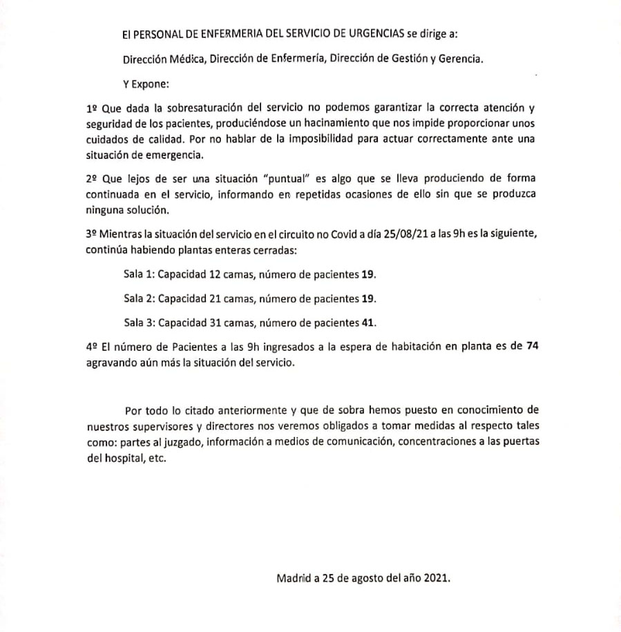 Carta enviada por los enfermeros de urgencias de la Paz a la dirección del Hospital
