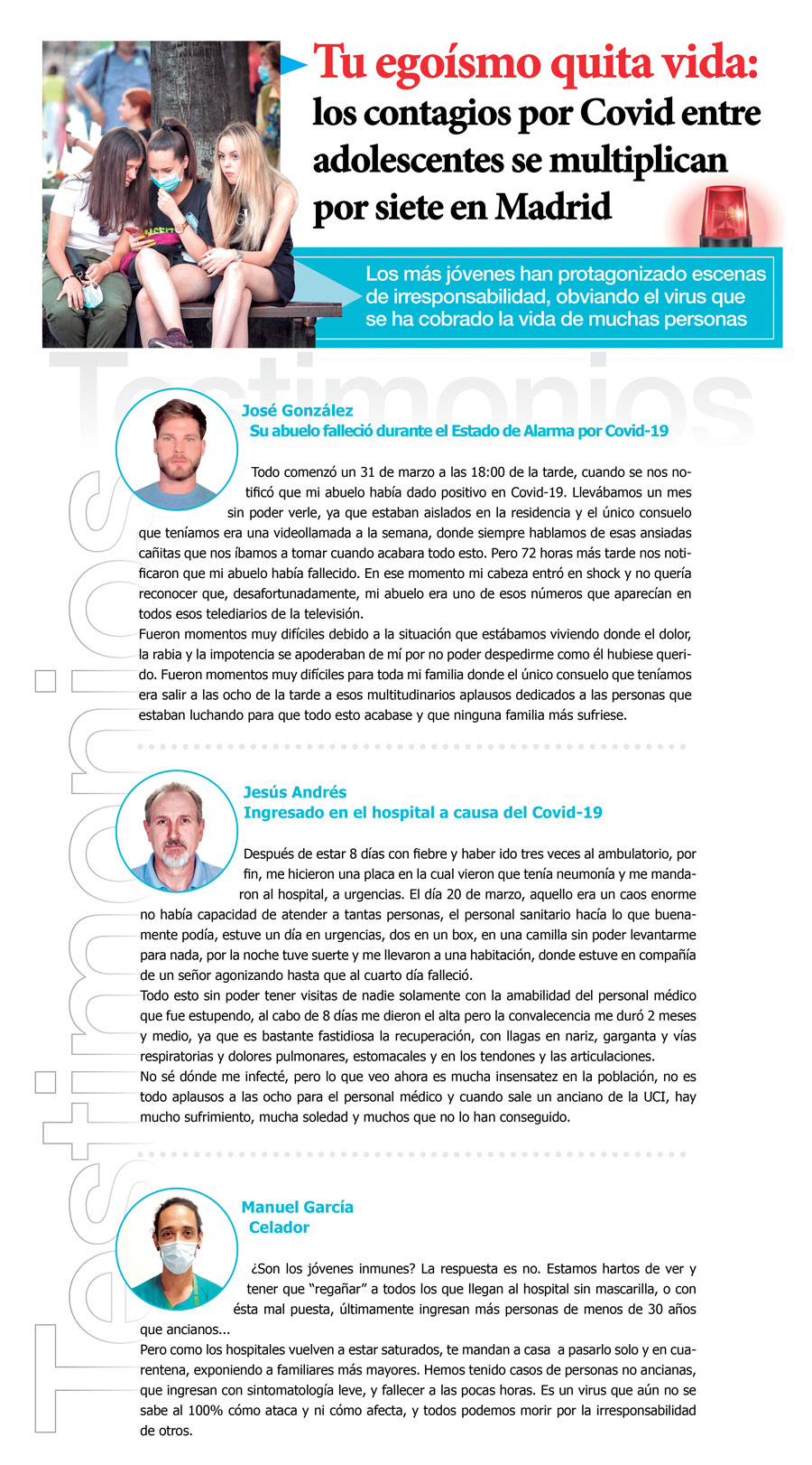 Se ha convertido en una estampa habitual ver a grupos de adolescentes sin mascarillas, obviando los 1,5 metros de separación recomendada y haciendo gala de la irresponsabilidad en discotecas y locales de ocio. Vuestra diversión sin conciencia es la condena de mucha gente. No sabéis lo que es ver a enfermeros, auxiliares, celadores y médicos atendiendo durante jornadas maratonianas a pacientes infectados con la única protección de una bata fabricada con una bolsa de basura, con las manos en carne viva por llevar guantes durante más de 12 horas o verles llorar por toparse con una realidad macabra al entrar en una residencia, asumiendo que no pueden hacer nada por salvar vidas. A ellos les debemos la pseudo libertad que disfrutamos hoy. A las fuerzas y cuerpos de Seguridad del Estado y al Ejército les debemos el reconocimiento de haber montado hospitales de campaña en tiempo récord y velar por nuestra seguridad en los momentos más complicados.