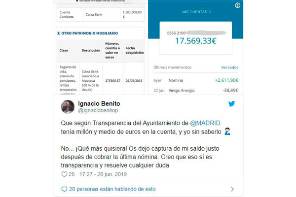 Un error de Transparencia del Ayuntamiento de Madrid atribuía al ex concejal socialista, Ignacio Benito, un millón y medio de euros en su cuenta corriente, algo que él mismo se ha encargado de desmentir utilizando para ello las redes sociales. En 140 caracteres el edil adjuntaba un pantallazo de su cuenta bancaria y defendía que esto se trataba de un error. Benito, secretario general del PSOE en Villa de Vallecas, contaba, según la imagen publicada, con 17.569,33 euros, ni céntimo arriba, ni céntimo abajo.