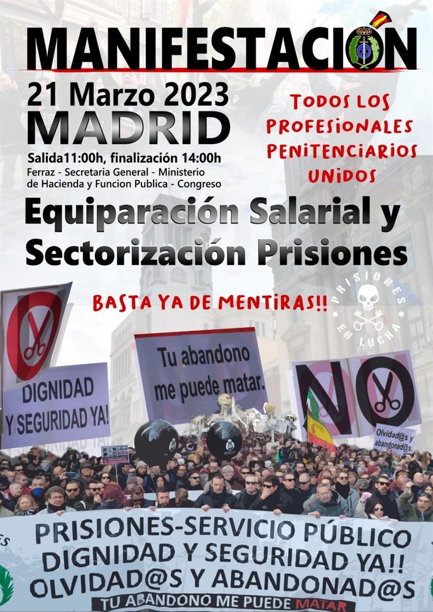 Los manifestantes, unas 3.500 personas que a diario tienen que lidiar con reclusos de toda índole, han portado una gran variedad de pancartas, dos esqueletos de gran tamaño y un ataúd, reivindicando el trabajo que desempeñan dentro de los centros penitenciarios. Del mismo modo, han vestido un brazalete de color negro en memoria de Francisco Aranda, un jefe de servicios hallado muerto dentro de su oficina.