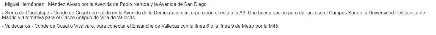 No obstante y "al no haber percibido esta mejora", solicitan un refuerzo especial de las líneas 10, 24, 57, 145 y 310, así como la ampliación del trayecto de la línea 111 desde Puente de Vallecas en las frecuencias.