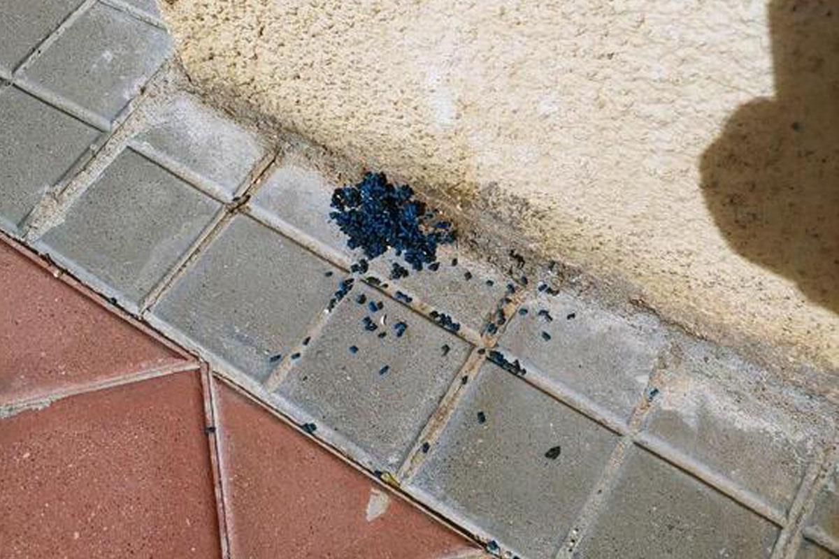 No es la primera vez que ocurre en esta zona que depositan veneno para gatos en las puertas de los garajes se ve veneno de la Urbanización El Pinar de El Plantío de Majadahonda. El veneno son como "bolitas" de color azul y puede ser muy peligroso para niños,