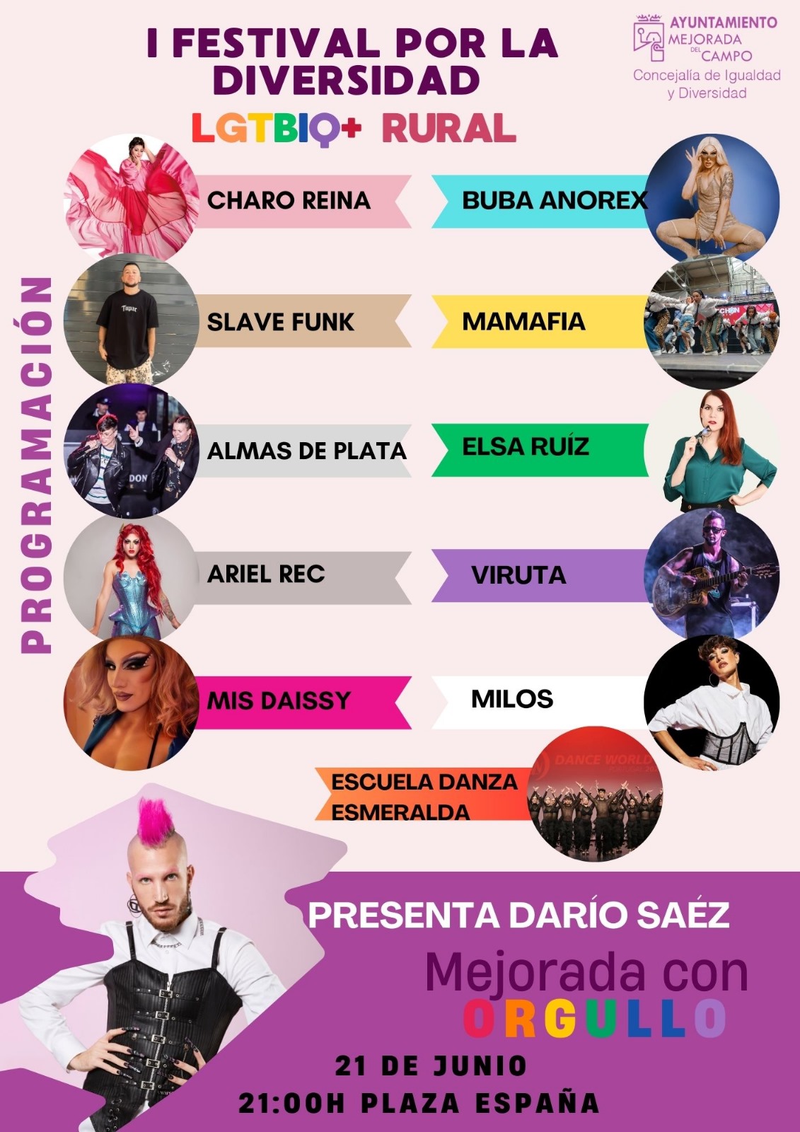 El Ayuntamiento de Mejorada del Campo, a través de la Concejalía de Igualdad y Diversidad, celebra el viernes 21 de junio su I Festival por la Diversidad LGTBIQ+ rural, desde las 21 horas en la Plaza de España.