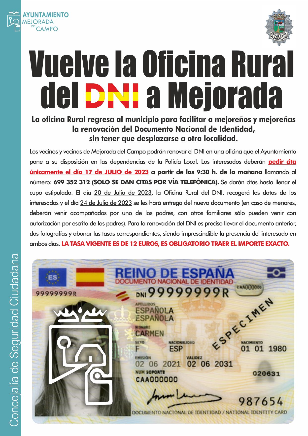 La Oficina Rural vuelve a Mejorada del Campo para facilitar a los vecinos y vecinas la renovación del Documento Nacional de Identidad. La tramitación del DNI se llevará a cabo en una oficina dispuesta por el ayuntamiento en dependencias de Policía Local.