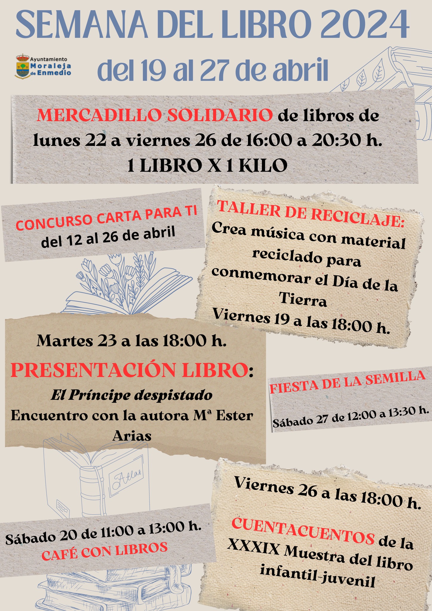 El viernes 26 desde las 18 horas, se celebrará el Cuentacuentos de la XXXIX Muestra del libro infantil-juvenil, y para cerrar los eventos organizados desde el Ayuntamiento, el sábado 27 de abril se realizará la “Fiesta de la Semilla” de 12:00 a 13:30.