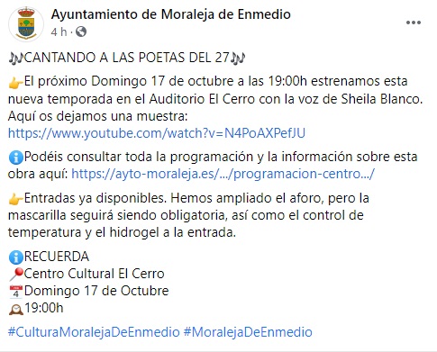 El Ayuntamiento de Moraleja de Enmedio ha compartido una publicación en Facebook en la que anuncia el estreno de la nueva temporada del Auditorio El Cerro