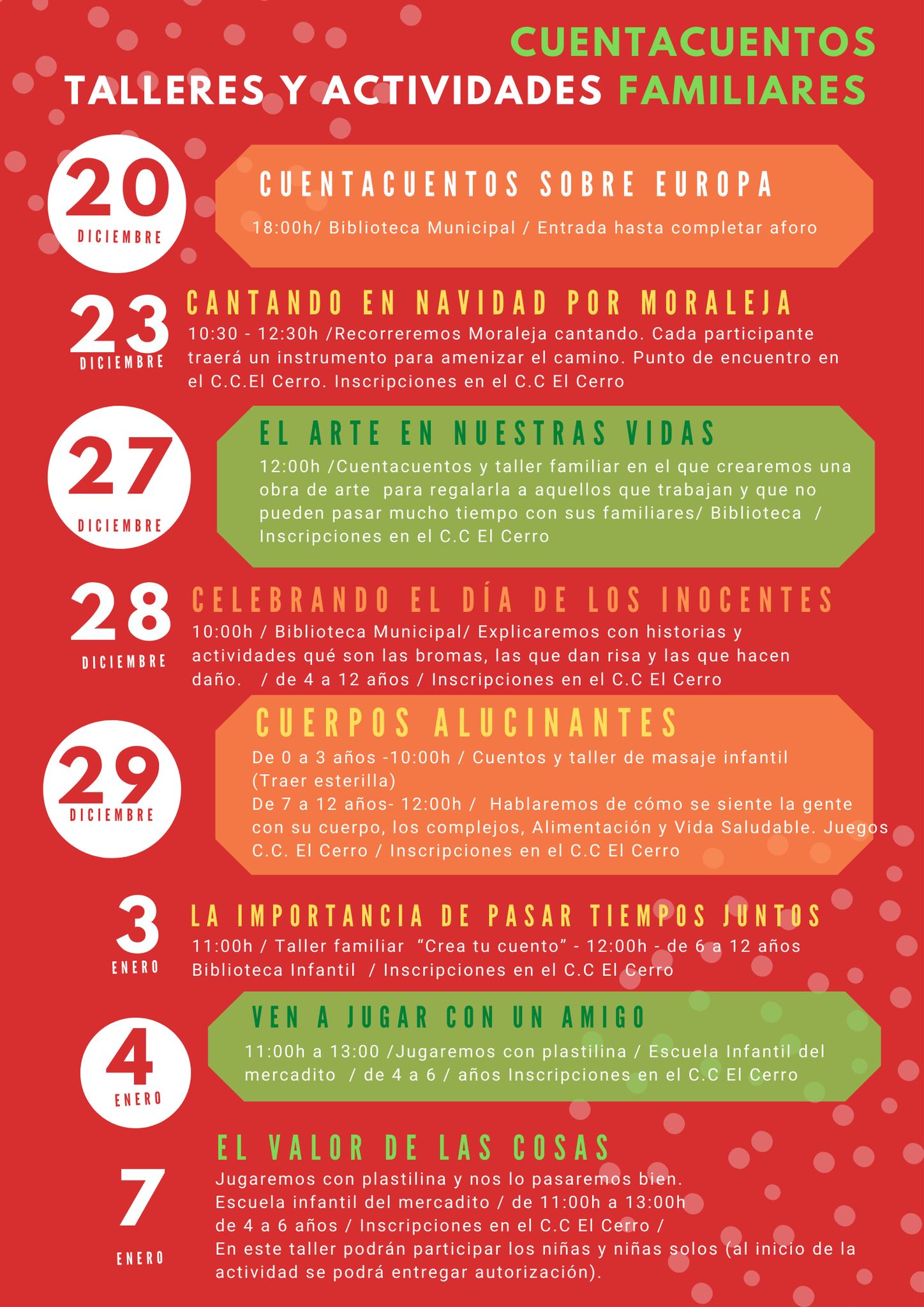 • El 28 de diciembre se presentará el cuentacuentos Día de los Inocentes, a las 10:00h. En esta actividad se explicará con historias y juegos qué son las bromas, las que dan risa y las que hacen daño. La edad para este taller es la comprendida entre los 4 y los 12 años. Será en la Biblioteca Municipal de Moraleja de Enmedio.