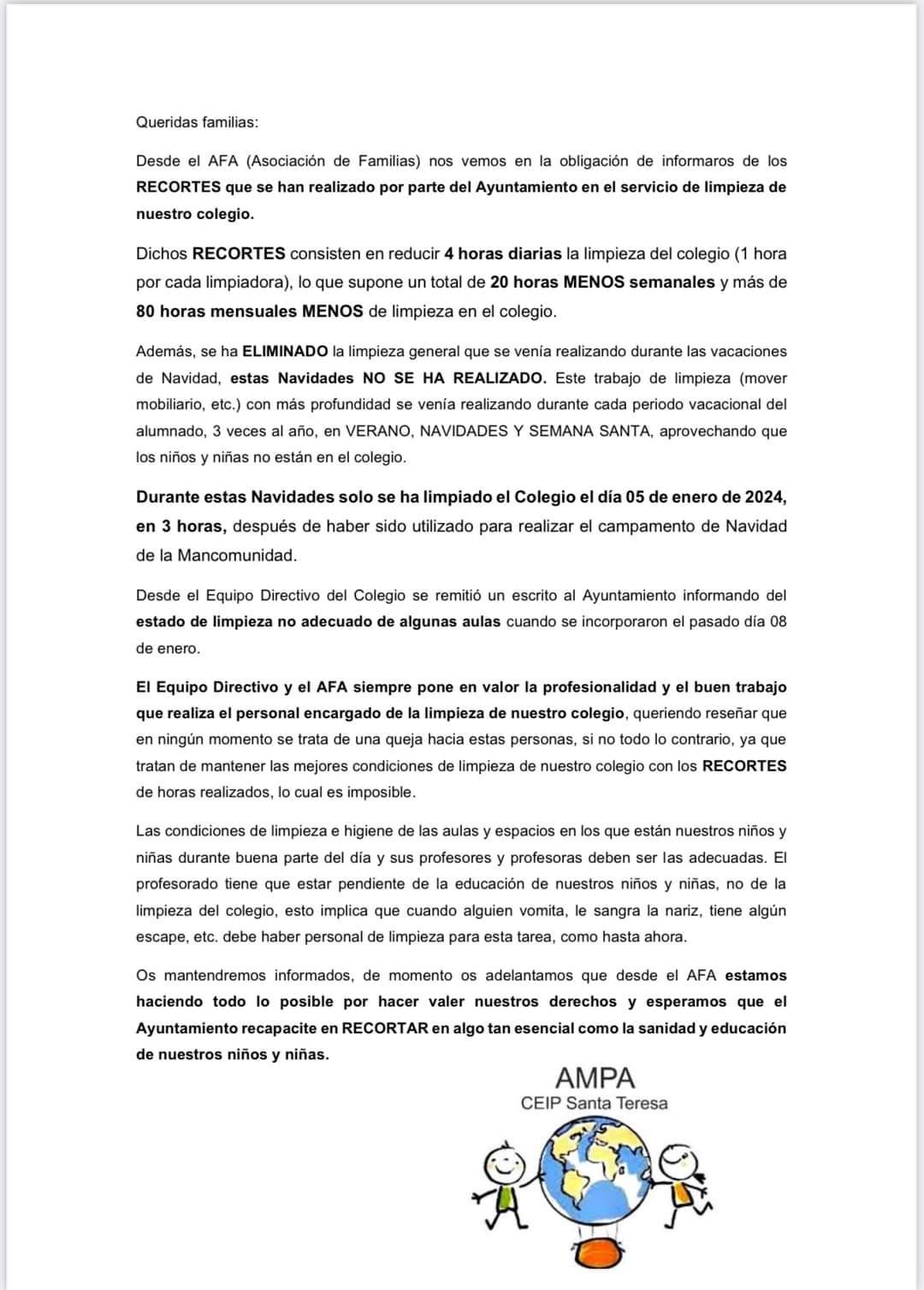 En el comunicado que han emitido desde el AFA, ponen el punto de mira en la corporación municipal, ya que no entienden como los recortes pueden ir dirigidos hacía unos sectores tan esenciales como lo son el de sanidad y educación. Desde la Asociación de Familias afirman que están haciendo todo lo posible por hacer valer sus derechos y esperan que el Ayuntamiento recapacite.