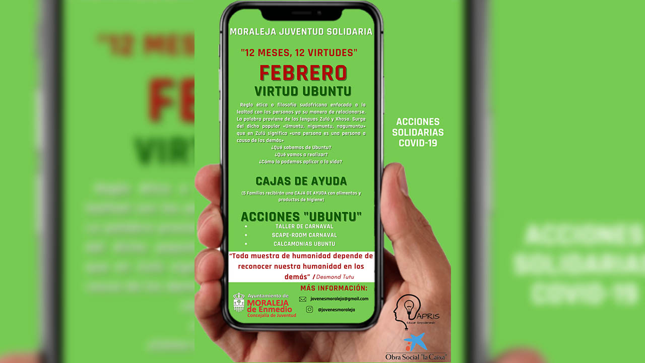 El proyecto ’12 meses 12 virtudes’, lanzado desde la Concejalía de Juventud del ayuntamiento del municipio, consiste en que cada mes se trabajará una virtud a través de distintas actividades. Entre las virtudes se podrán encontrar igualdad, salud, bienestar, confianza, colaboración y solidaridad. En febrero se centra en una virtud proveniente de Sudáfrica, el Ubuntu.