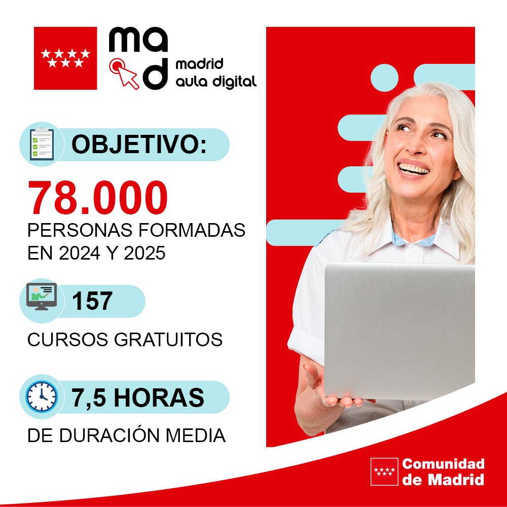 Madrid Aula Digital (MAD) es una actuación global diseñada por la Consejería de Digitalización que nace con el propósito de atender inicialmente a cerca de 80.000 madrileños y formarles gratuitamente en habilidades básicas y avanzadas, adaptados a los conocimientos del alumno y que se impartirán en diferentes modalidades (presencial, on-line o mixtos).
