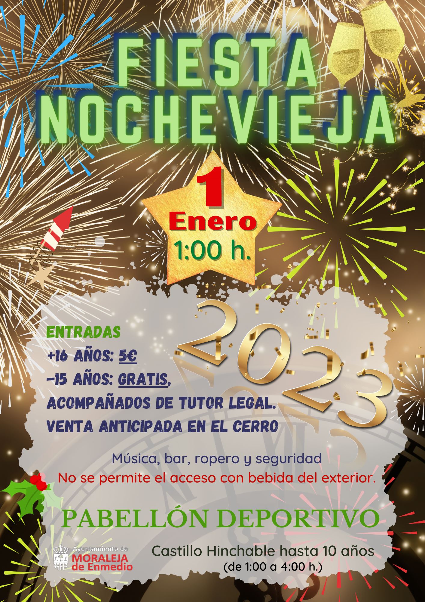 A pocos días de despedir el 2022, muchos empiezan a pensar cómo celebrar la bienvenida al nuevo año. Moraleja festejará la Nochevieja con una fiesta en el pabellón deportivo, que contará con música, bar, castillo hinchable para los niños de hasta 10 años -en horario de 1.00 a 4.00-, ropero y seguridad. La entrada para los asistentes de menos de 15 años es gratuita y para el resto costará 5 euros; eso sí: los menores deberán ir acompañados de un tutor legal, y no se permite el acceso con bebida del exterior. Si quieres adquirir la tuya, podrás hacerlo de forma anticipada en el Centro Cultural "El Cerro".