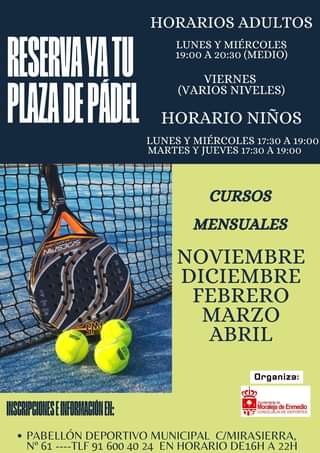 ¿Te gusta jugar al pádel?¿Te apetece iniciarte en este deporte? Ahora tienes la oportunidad perfecta, porque contarás con nuevos cursos mensuales intensivos durante este mes de noviembre y también en diciembre, febrero, marzo y abril. Para los adultos, el horario establecido es de 19 a 20.30 los lunes y miércoles (nivel medio) y los viernes para varios niveles. Los más pequeños, por otra parte, practicarán lunes y miércoles de 17.30 a 19 o martes y jueves en idéntico horario.