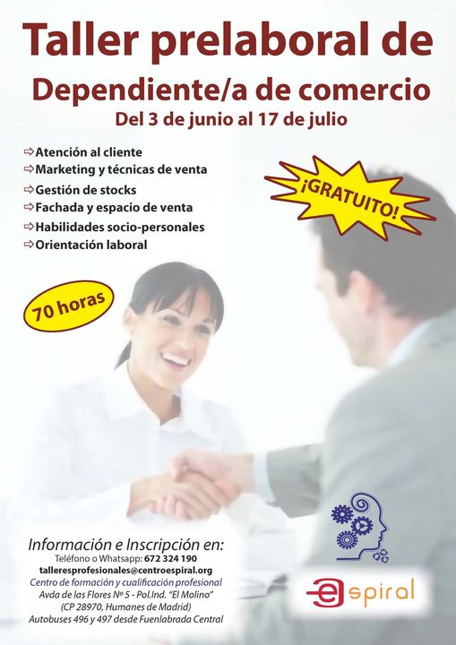 Desde el próximo 3 de junio al 17 de julio el Centro de Formación Profesional Espiral situado en Humanes de Madrid (Avenida de las Flores nº5) impartirá un taller prelaboral de dependiente de comercio. El curso se impartirá todos los lunes, miércoles y viernes desde las 10:00 hasta las 13:30. El taller es completamente gratuito, y para poder participar es necesario ser mayor de 16 años y tener las habilidades de comunicación lingüísticas suficientes para cursar con aprovechamiento la formación.