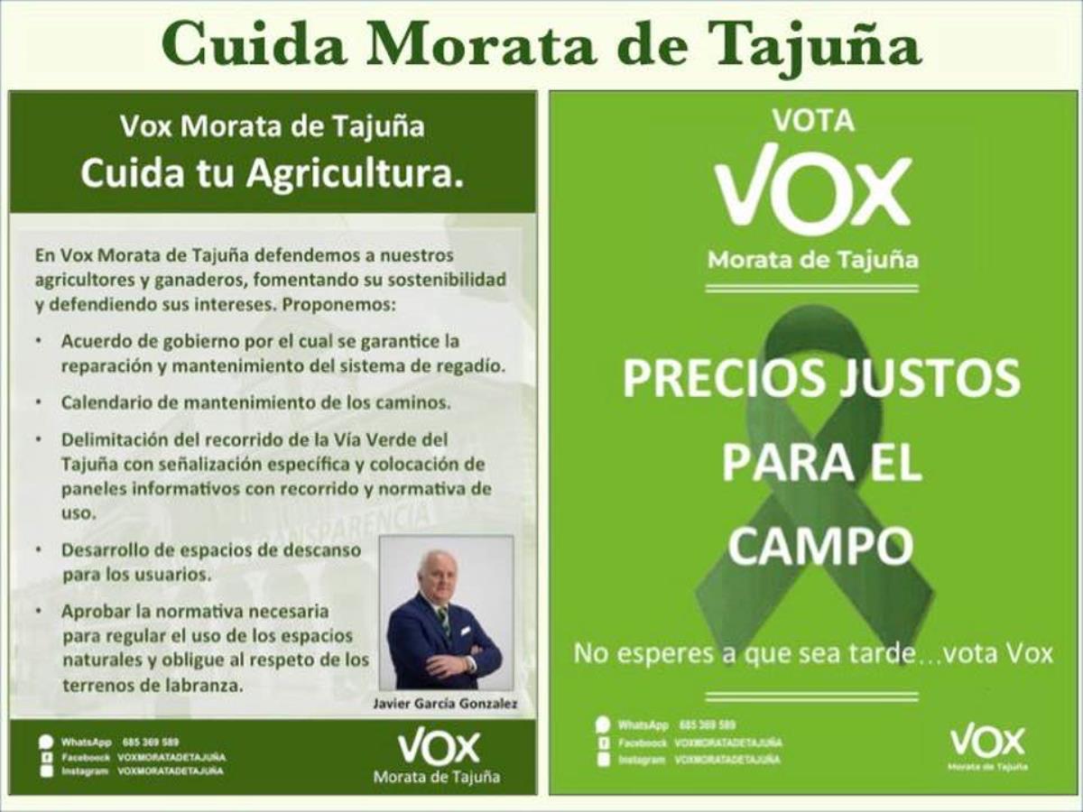 VOX Morata de Tajuña presenta su programa electoral para las elecciones del 28 de mayo de 2023. En el documento, destacan algunas propuestas en materia de medio ambiente como la aplicación de un vivero municipal donde se desarrollen plantas autóctonas, el desarrollo verde del municipio con el día de ‘Morata Verde’, con el fin de buscar la repoblación de zonas verdes y rurales, así como la ampliación de la Vía Verde La Vega del Tajuña.