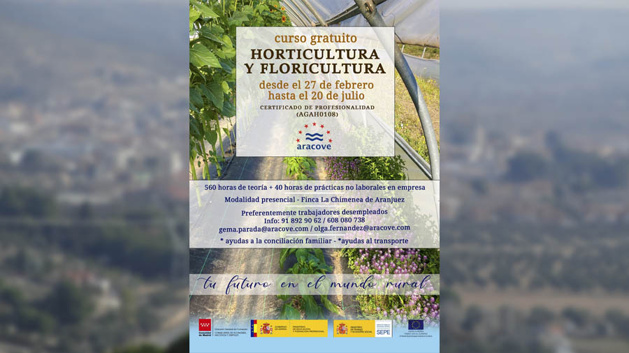 El primer curso gratuito de formación con certificado de profesionalidad que ofertará  la Asociación de Desarrollo Rural Comarca de las Vegas y Alcarria de Alcalá (ARACOVE) está consagrado a la enseñanza de la horticultura y floricultura. El curso se impartirá en la Finca La Chimenea de Aranjuez entre el 27 de febrero y el 20 de julio de este mismo año, y estará compuesta de 560 horas de teoría y 40 horas de prácticas no laborales en empresas