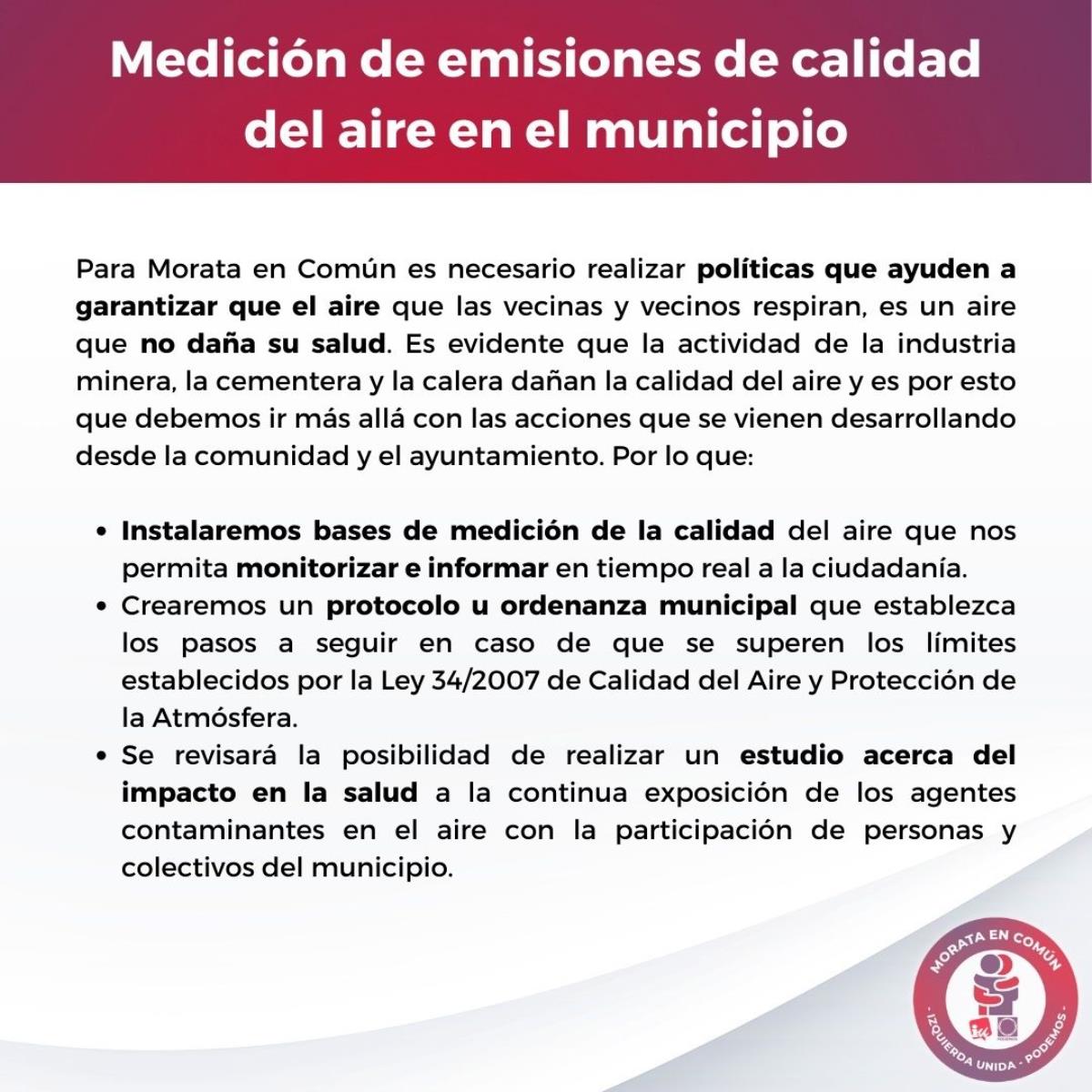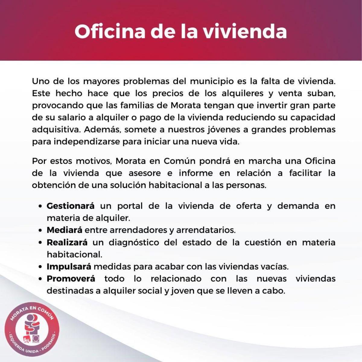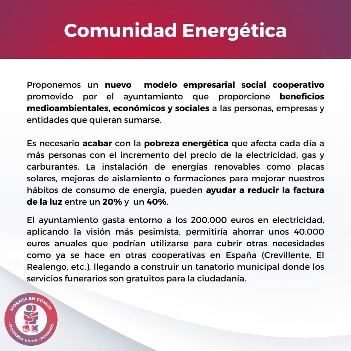 Morata en Común (Podemos-IU-Alianza Verde) presenta su programa electoral para las elecciones del 28 de mayo de 2023. En el documento, destacan algunas propuestas en materia de ecologismo como crear un nuevo modelo empresarial respetuoso con el medio ambiente, acabar con la pobreza energética y reducir la factura de la luz entre un 20% y un 40%.