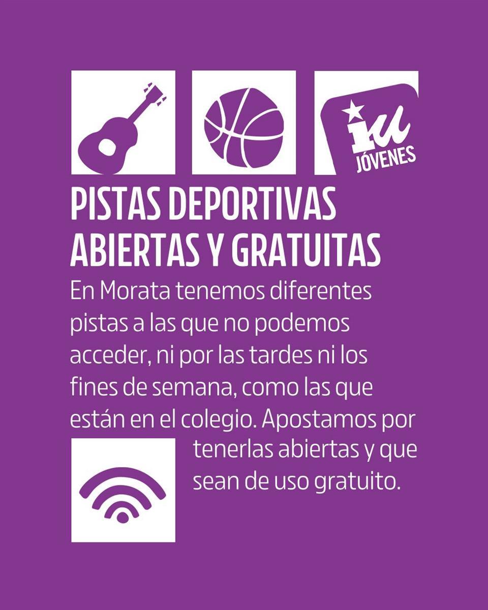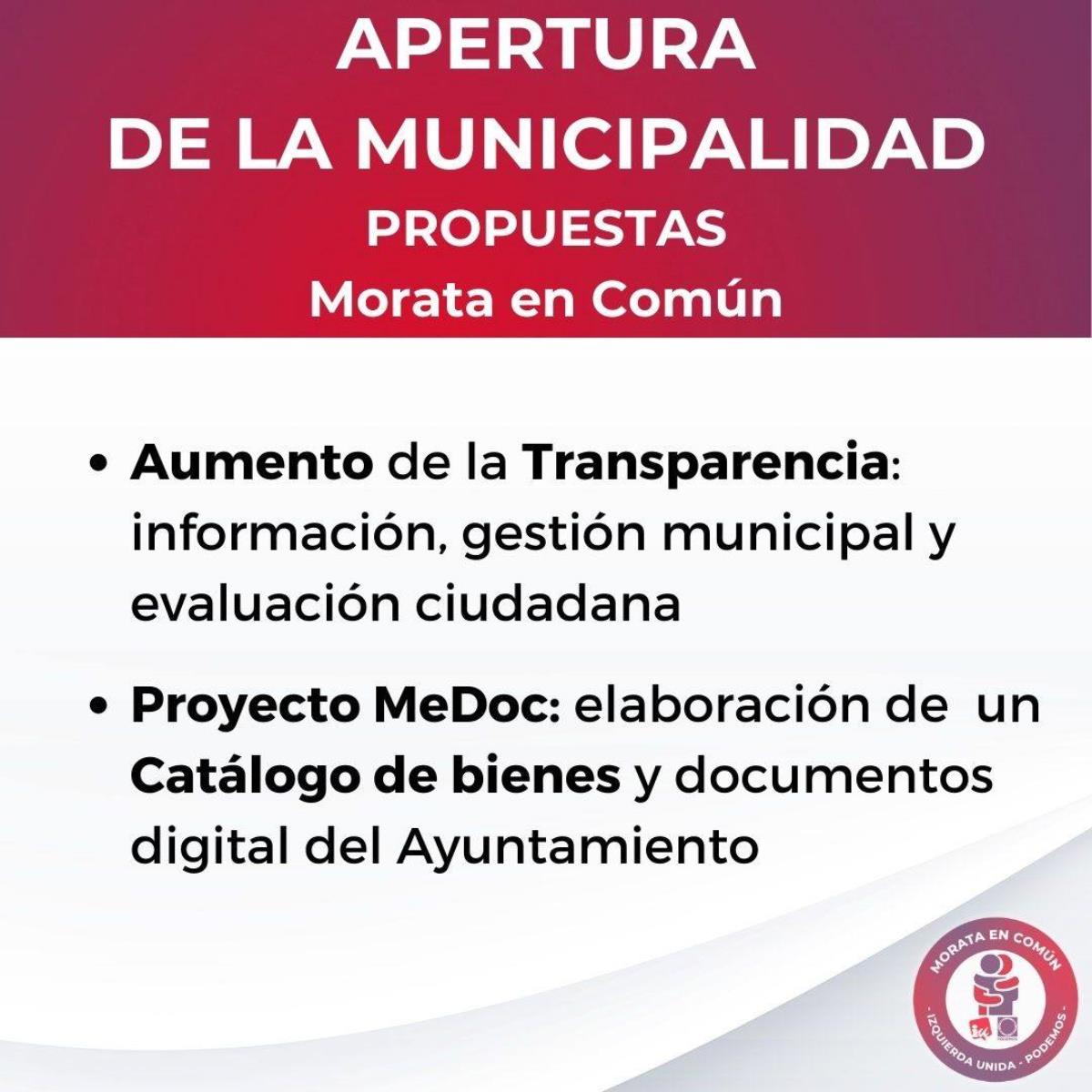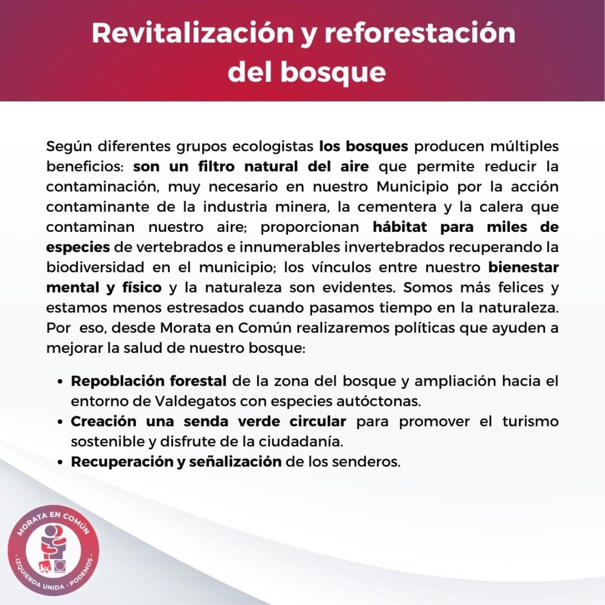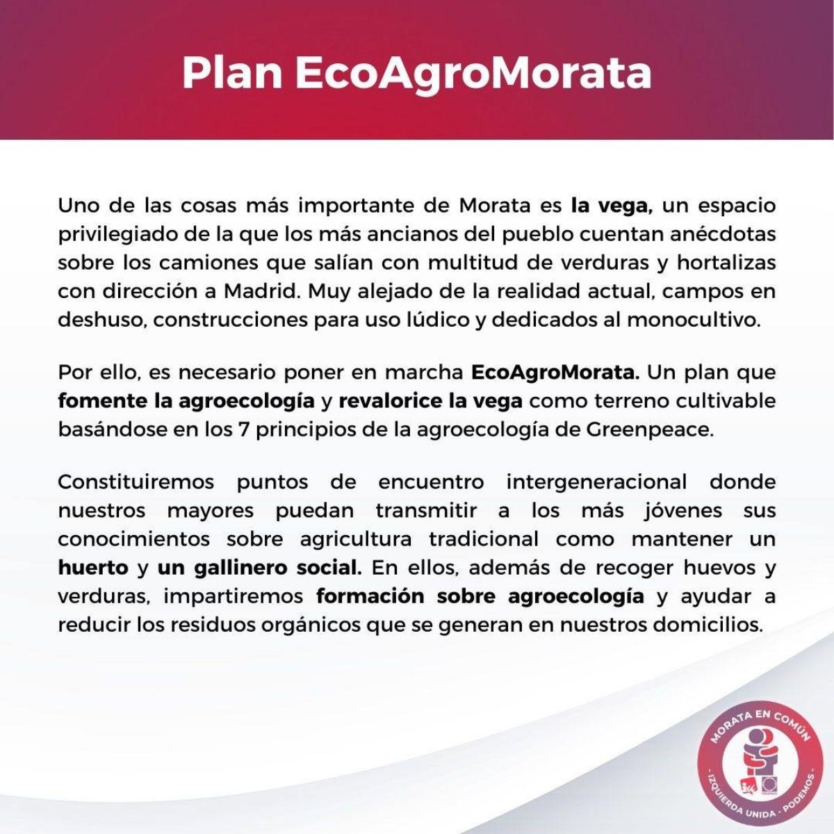 Morata en Común (Podemos-IU-Alianza Verde) presenta su programa electoral para las elecciones del 28 de mayo de 2023. En el documento, destacan algunas propuestas en materia de ecologismo como crear un nuevo modelo empresarial respetuoso con el medio ambiente, acabar con la pobreza energética y reducir la factura de la luz entre un 20% y un 40%.