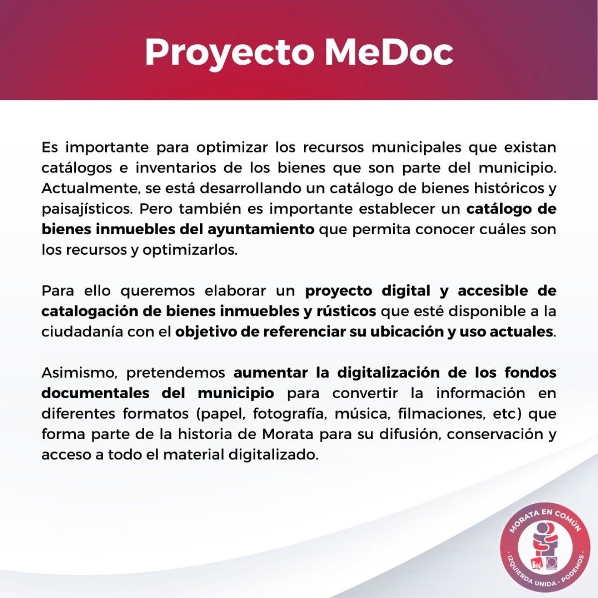El proyecto ‘MeDoc’, del mismo modo, es un punto importante en su programa. Por ello, prometen elaborar un plan digital y accesible de catalogación de bienes inmuebles y rústicos, con objeto de referenciar su ubicación y uso actuales. Igualmente, prevén la digitalización de los fondos documentales del municipio.